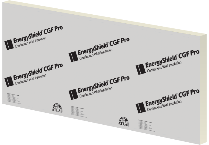 Atlas EnergyShield CGF Pro is a high-performance continuous insulation board composed of a closed-cell polyisocyanurate foam core with patented coated glass-mat facers on both sides. One side is dark gray for use in open joint rain screen applications. It is manufactured using environmentally responsible processes and formulations, containing no CFCs, HCFCs or HFCs, resulting in Zero Ozone Depletion Potential (ODP) and Negligible Global Warming Potential (GWP). EnergyShield CGF Pro is GREENGUARD Gold certified and contributes to LEED credits. Boards are available in sizes 4' x 8' or 4' x 9' and thickness from 0.5" - 4".