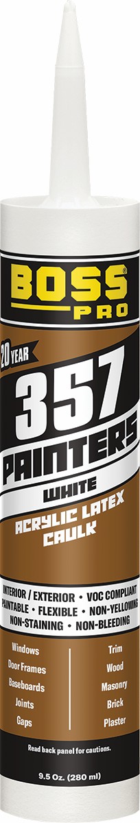 BOSS by Soudal Painter's Sealant, 357 Series, 9.5 oz Net Content, Cartridge Container, Paste Form, White, Composition: 1 to 5% Dipropylene Glycol Dibenzoate, 1 to 5% Titanium Dioxide, 1 to 5% Distillates (petroleum), Hydrotreated Middle, 0.1 to Max Sodium Nitrite, 2 hr Dry Time, 25 min Setting, 8 pH, 1.72 Specific Gravity, 8.6 g/L VOC, 750000 cPs Viscosity, 100 deg C Boiling Point, Density: 14.3541 lb/gal, Lighter Than Air Vapor Density, Applicable Materials: Brick, Masonry, Plaster, Wood, 12 months Shelf Life, -20 to 185 deg F, 300% Elongation