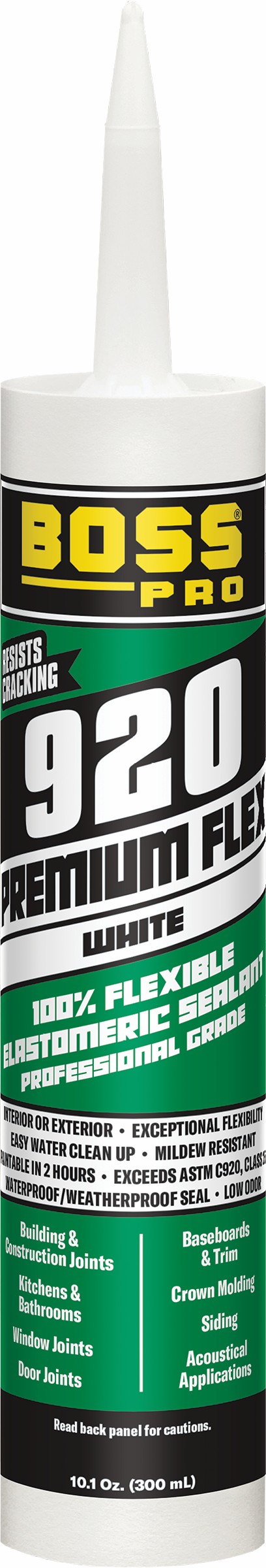 BOSS by Soudal Elastomer Sealant, 920 Series, 10.1 oz Net Content, Cartridge Container, Paste Form, White, Silicone Base, <25 min Setting, 7.8 to 8.2 pH, 13.7 g/L VOC, Density: 12.2 lb/gal, Applicable Materials: Brick, Concrete, Drywall, Glass, Masonry, Metal, Wood, 12 months Shelf Life, -20 to 185 deg F