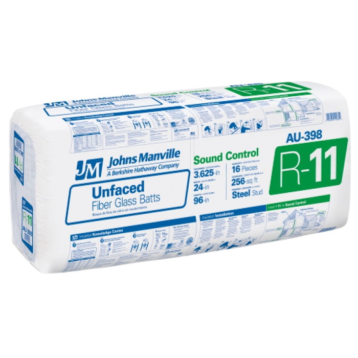 JM Insulation Batt, 3-5/8 in Thickness, 24 in Width, 96 in Length, Unfaced Facing, R-Value: R11, Fiberglass, 256 sq-ft Coverage Area