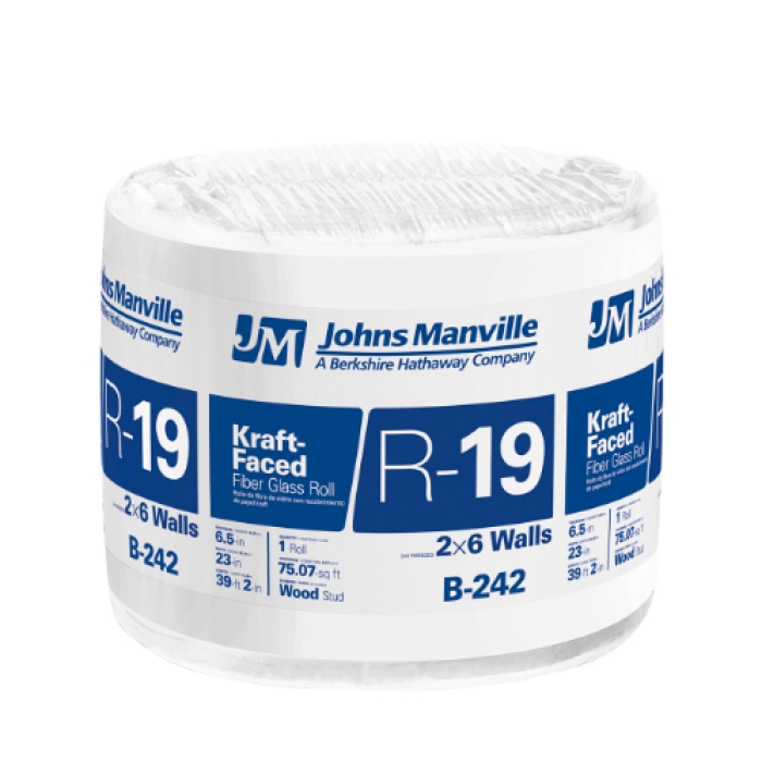 JM Insulation Roll, 6-1/2 in Thickness, 23 in Width, 39 ft 2 in Length, Narrow Style, Kraft Facing, R-Value: R-19, Ceiling, Floor, Wall Installation, Fiberglass, White, 75.07 sq-ft Coverage