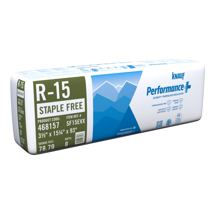 Knauf® High-Density Batt Insulation, 3-1/2 in Thickness, 15-1/4 in Width, 93 in Length, Kraft Facing, R-15 R-Value, 400 deg F, Attic, Basement, Ceiling, Crawlspace, Floor, Wall Installation, Fiberglass, Brown, 78.79 sq-ft Coverage Area, Resists: Tear, Staple-Free